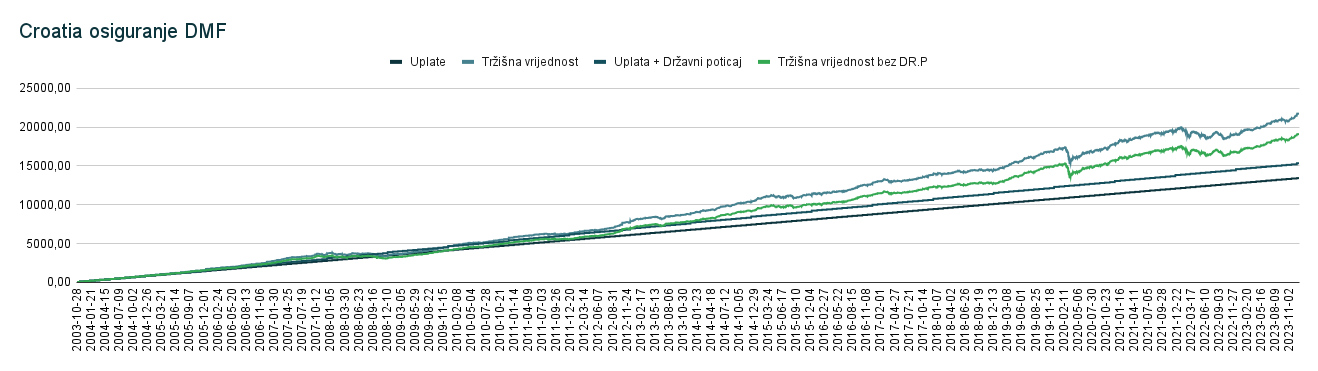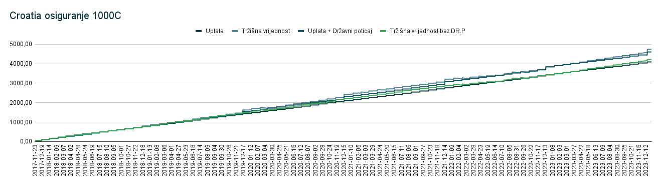 Druga bitna informacija je, ukoliko ulažete u manje rizičnije fondove poput Croatia Osiguranje 1000C, sav vaš prinos od fonda je pretežit u državnim poticajima. Točnije za svaki 1,00 EUR koji je stvorio fond od Vaših investicija, država vam je poklonila 4,01 EUR. Preko 80% prinosa čini državni poticaji i njeni prinosi od fonda.