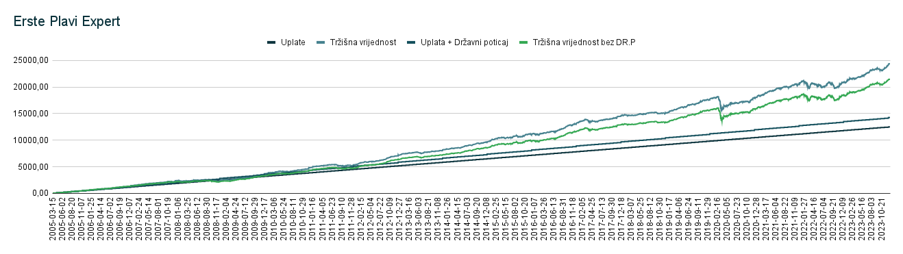 Sukladno gornjoj činjenici da od 25% do 80% prinosa čine državni poticaji, zanimalo me je li onih 5% i nešto sitno prinosa Erste Plavi Expert s kojim se mnogi finfluenceri hvale kao razlog za investiranje, doista 5% ili su u njih uključeni i državni poticaji.