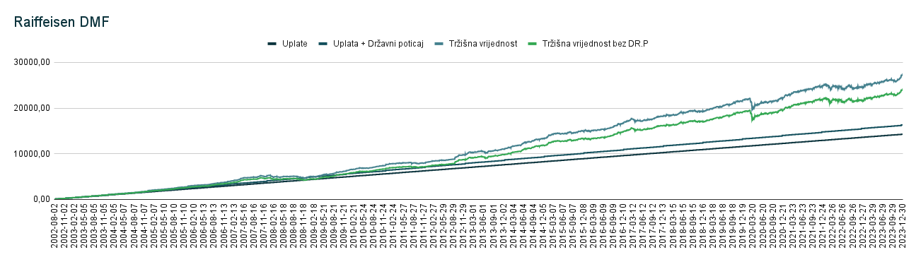 Kad pridodate prinose koji su ti novci ostvarili time što su se isto uložili u fond, godišnji prinosi narastu na 0,97% do 2,20%. Najgori prinos u ovom slučaju nema Raiffeisen DMF kao najstariji fond, već Croatia Osiguranje DMF.
