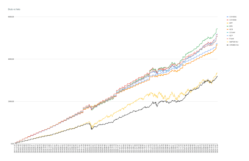 U slučaju investiranja iz bruto plaće, možemo vidjeti da treći mirovinski stupovi imaju bolje prinose od SP500 i CROBEX-a u “kraćim” razdobljima. U ovom trenu, to je razdoblje od osnivanja fondova Croatia Osiguranje 1000A i 1000C.