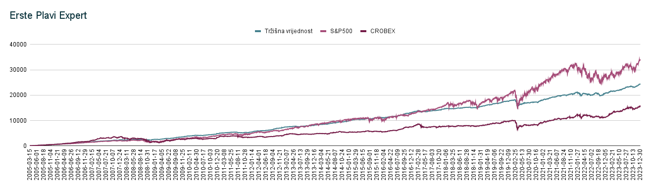 Za razliku od neto usporedbe, kada usporedimo prosječne godišnje prinose od osnutka fonda do 31. prosinca 2023. možemo primijetiti da fondovi trećeg mirovinskog stupa imaju i dalje lošije prinose od SP500 i CROBEX-a u svim razdobljima osim onog najmlađih fondova (CO 1000A i CO 1000C) te Erste Plavi Expert.