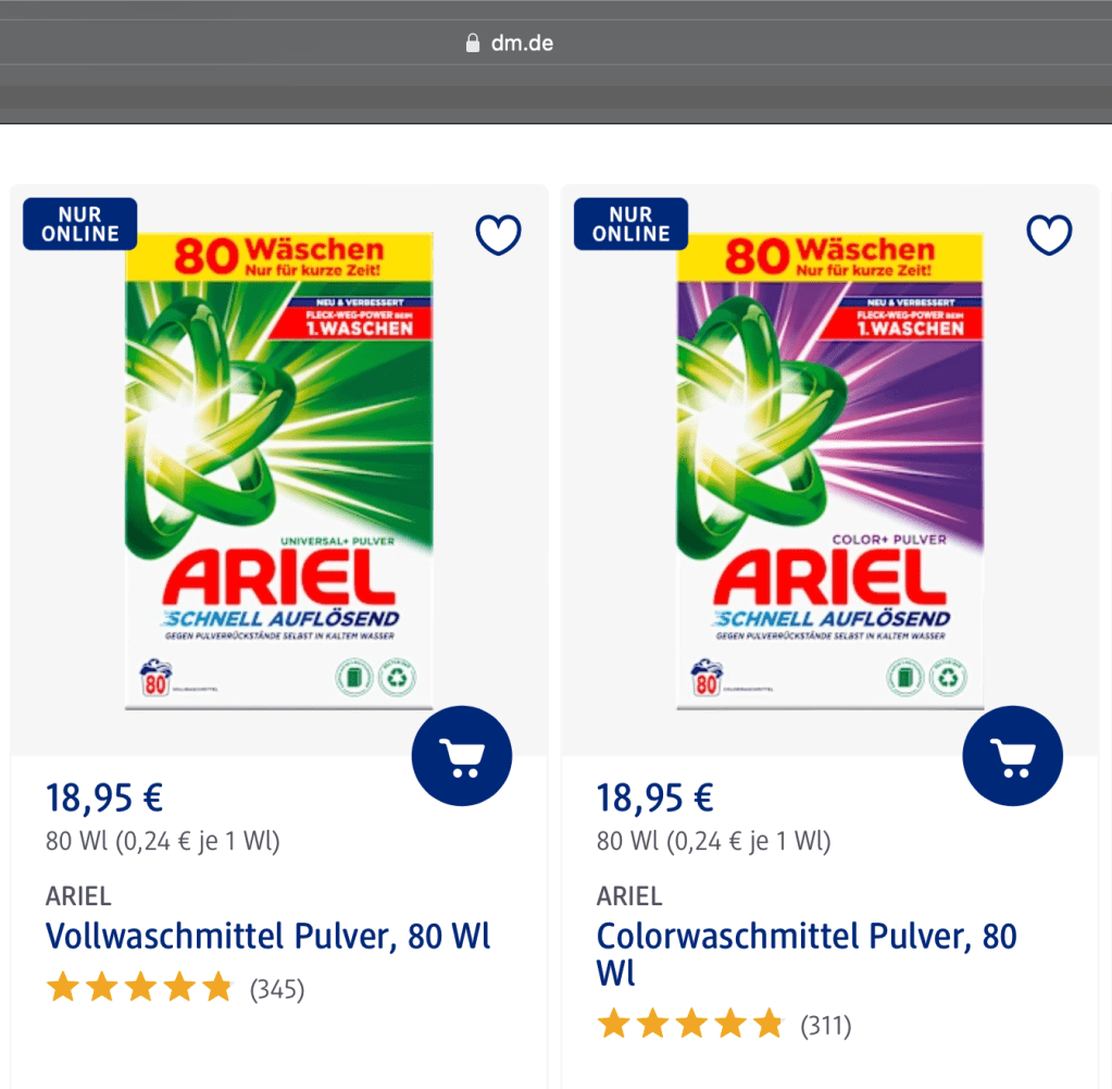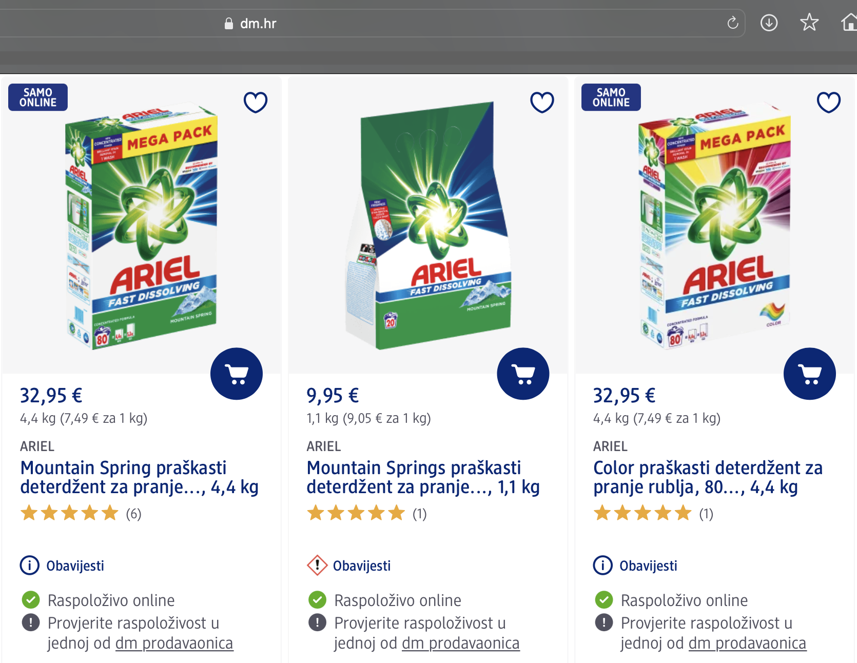 - Ariel prašak za rublje — U Njemačkoj se pakiranje za 80 pranja teško 4,8 kg prodaje po povoljnijoj cijeni, dok je u Hrvatskoj dostupno pakiranje od 4,4 kg za 74 posto višu cijenu.