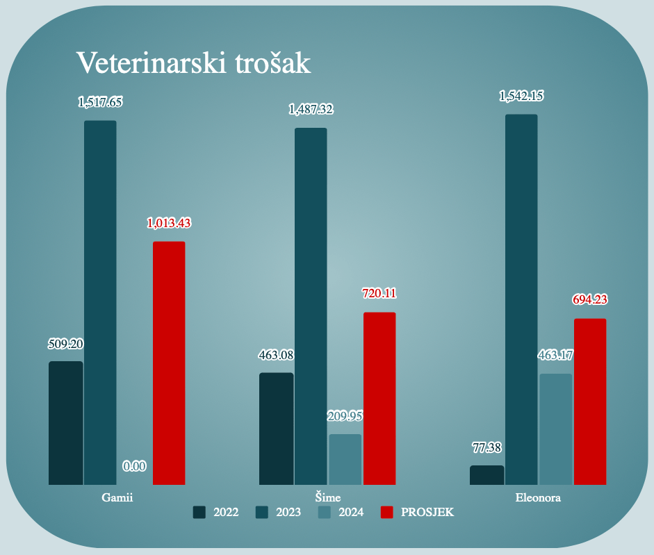 Također, u jednoj kategoriji pratila sam troškove opreme (krevetići), igračaka te njege i higijene dlake i noktiju, za što sam u prosjeku trošila 97 € godišnje.